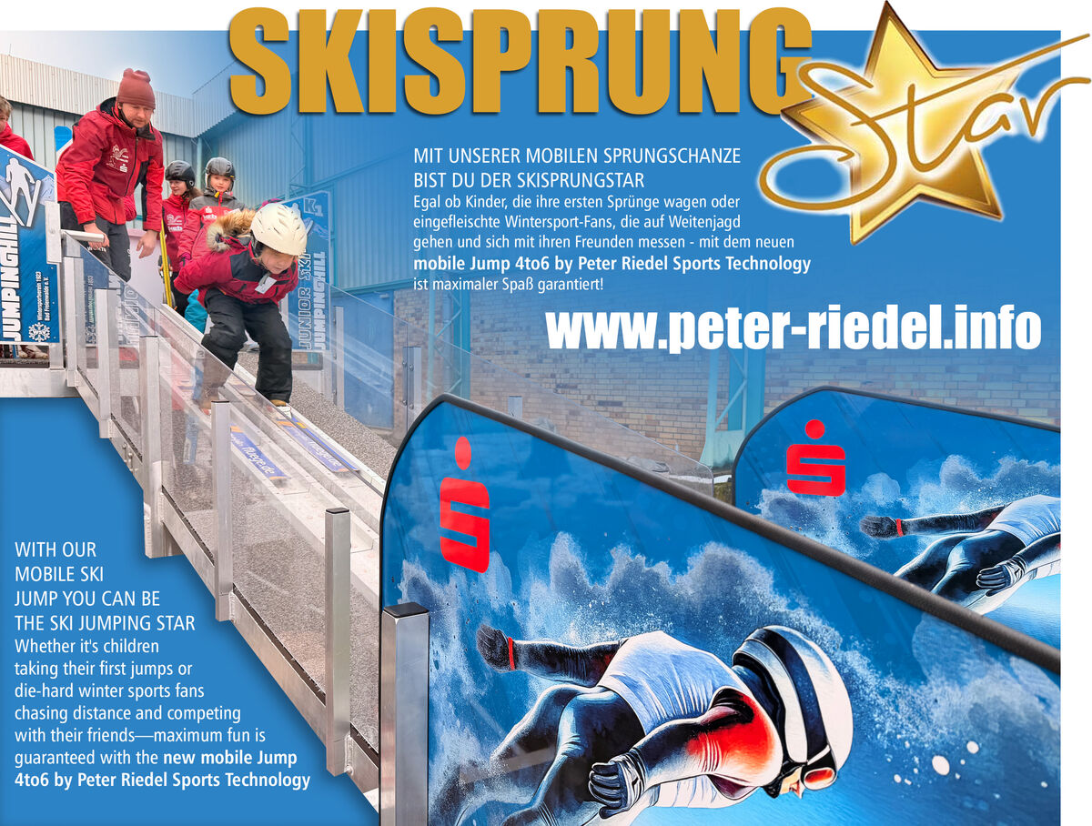 Rauf auf den Balken, Sprungski anschnallen und los gehts! Dieses Gefühl kann ab jetzt jedermann haben! Mit dem neuen MOBILE JUMP K1 der Peter Riedel Sports Technology kann sich ab jetzt jedermann als Skispringer fühlen. Mit Hochdruck arbeiteten wir die letzten Wochen an unserem neuen Projekt. Herausgekommen ist eine mobile Sprungschanze, die maximalen Skisprungspass für jedermann garantiert. Bei Sprungweiten von 4 bis 8 Meter ist es egal, ob Kinder ihre ersten Sprünge wagen oder eingefleischte Wintersport-Fans sich mit ihren Freunden messen. Auf unserem kleinsten mobile Jump kämpften schon Stars wie Jens Weißflog um jeden Meter, mit dem neuen MOBILE JUMP K1 geht es nun fast doppelt so weit!